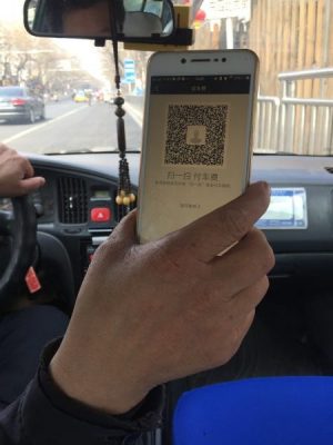 A Beijing taxi driver holds up a QR code to scan for payment via WeChat