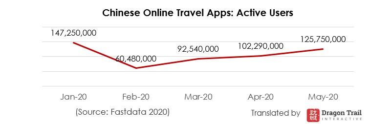 There were a total pf 125.75 million active online travel app users in China in May, up from a low of 60.48M in February, and approaching the 147.25M online travel app users in January 2020.