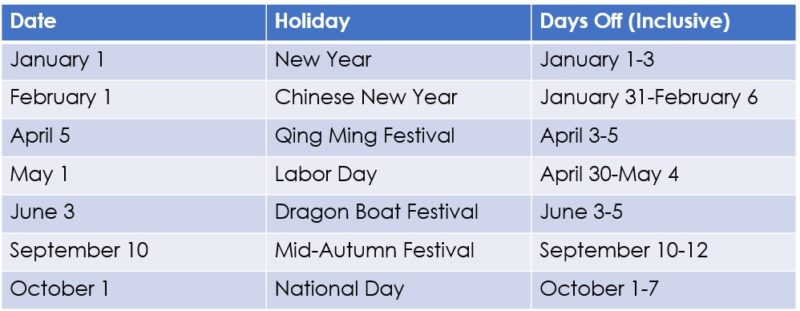 Click here to read the announcement from the Chinese government, including details on working weekend days.