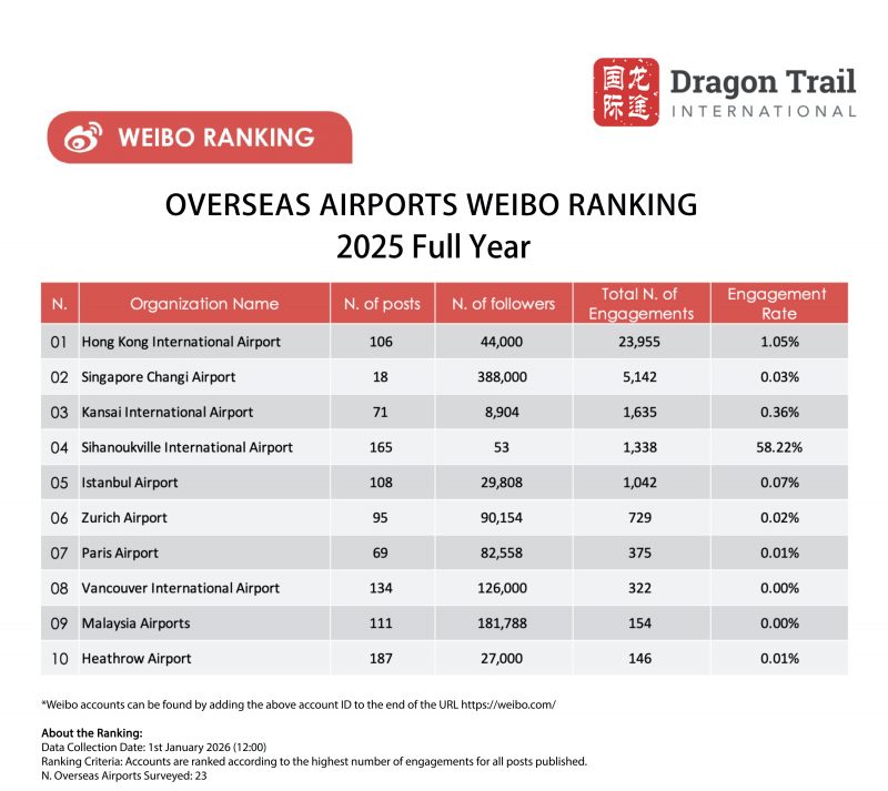 In Q4, Sihanoukville Airport climbed up the rankings, with an extremely high engagement rate caused in large part by the fact the account had fewer than 200 followers. Its most popular post shared a traveler’s video of diving in Koh Rong Samloem. Zurich Airport also ended the year well, with Christmas and New Year F&B promotions attracting attention on Weibo.
