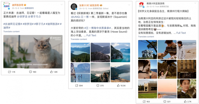 (Left to right) Dubai’s video featuring Chinese actors and a jealous cat, Destination BC’s post on locations and outdoor activities featured in Wang Yibo’s TV series, and Liu Xueyi visits Kangaroo Island, South Australia