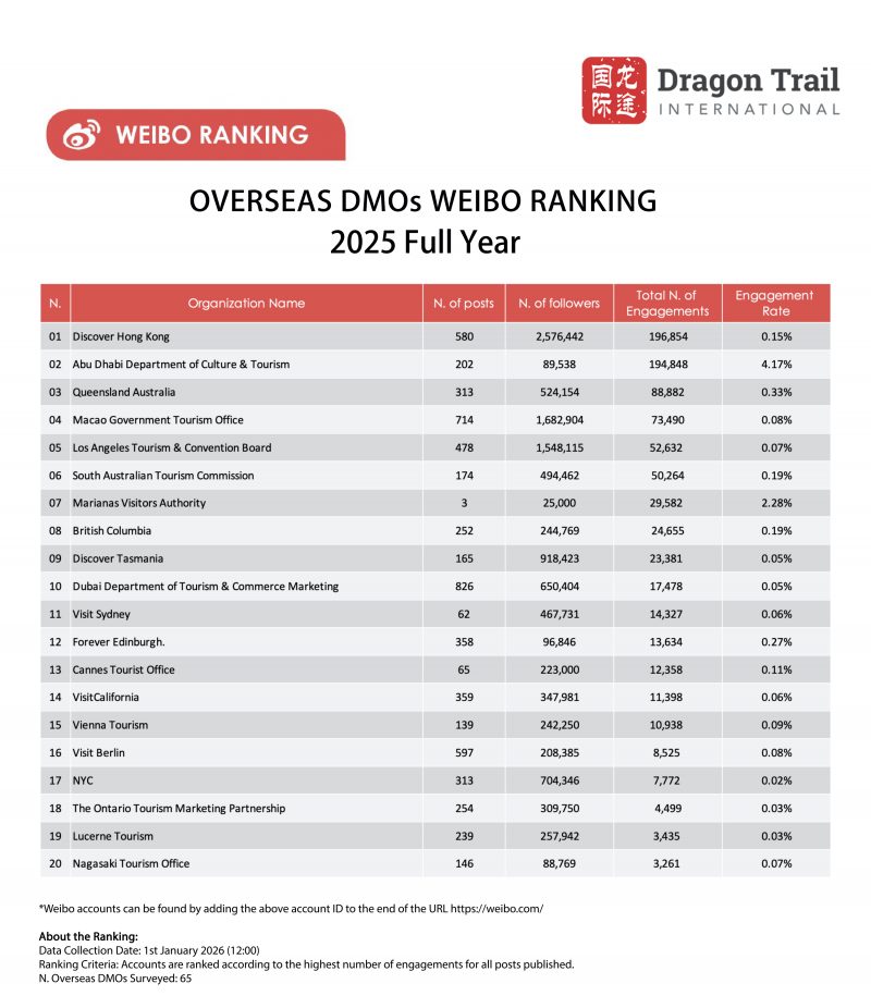 Dragon Trail International’s Weibo Rankings Report tracks and analyzes performance for national tourism organizations (NTOs), destination marketing organizations (DMOs), airlines, airports, cruise lines, museums & attractions, and hotels. Our quarterly Weibo reports build industry benchmarks and uncover best practices in digital marketing in the travel sector.