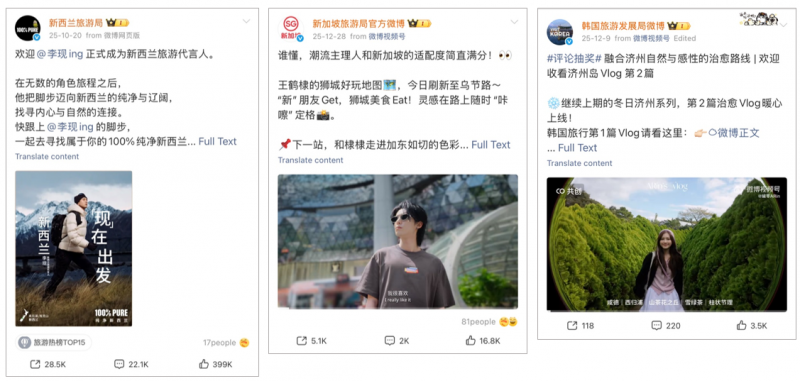 Other top Weibo posts from national tourism boards throughout the year included Norway’s promotion of the travel TV show Divas Hit the Road – which filmed in Norway this year – and a short video from the Tourism Authority of Thailand about the Grab ride hailing app, endorsed by Thai-Chinese acting duo Lingling Kwong and Orm Kornnaphat, aka LingOrm.