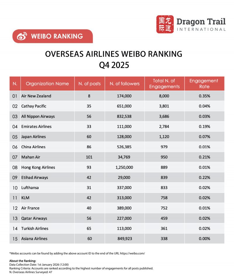 With nearly 8,000 engagements, the top Weibo post of Q4 came from Air New Zealand, which topped the ranking table thanks to New Zealand’s new brand ambassador, actor Li Xian. The next most-engaging Weibo post by an airline in Q4 2025 was Emirates’ recap of a gala event to celebrate the launch of their Hangzhou-Dubai flights, with a performance by singer Jike Junyi.