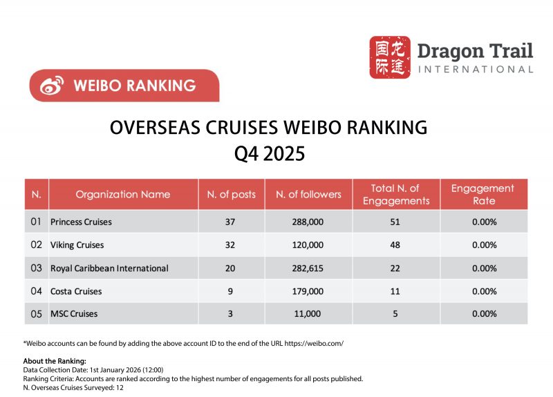 Weibo is not a platform that delivers strong results for international cruise lines, and engagement was even lower in 2025 than the previous year. Ranked in first place is Princess Cruises – its most popular content was a series of giveaways in Q2 and Q3, which generated 107 engagements in total. With just 13 likes, Viking’s top Weibo post of the year was a Mid-Autumn Festival gift box giveaway in September.
