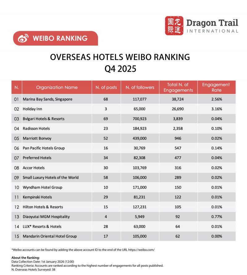 Hotels continued to generate the most engagements through celebrity events and partnerships in 2025. In contrast to 2024, Singapore’s Marina Bay Sands hotel had an engagement rate of just 1.39% this past year, down from 26.36% the year before. The hotel’s total engagements in 2025 were just 5.5% the number from the previous year. However, it still ranked in 2nd place for both total engagements and engagement rate. Its top posts all related to Marina Bay Sands as a live event venue, including a giveaway for tickets to the Weibo Gala 2025 in November, information about a special screening and fan event in May for the TV series Love in Pavilion – alongside an exclusive interview with its stars, and an announcement about Henry Lau’s concert at the end of the year.