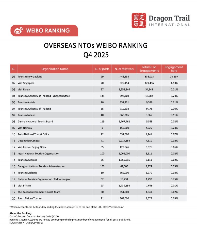 Australia topped the Weibo rankings for national tourism boards for the second year in a row, thanks to the tourism board’s ongoing collaboration with Chinese actor Yu Shi. However, in the last quarter of the year, Australia dropped to 13th place for total engagements, with New Zealand in first place. New Zealand also published the most-engaging tourism board post of the year in November, announcing actor Li Xian as their new tourism ambassador – the post received nearly 400k likes.