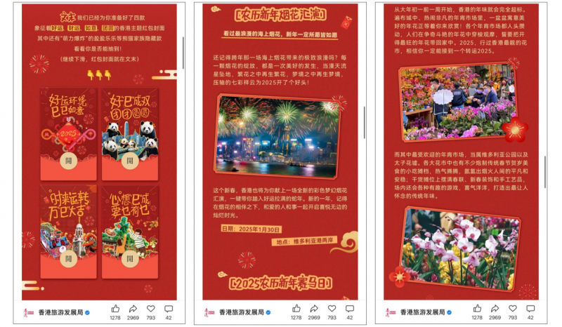 Digital red envelopes for Chinese New Year are always huge on WeChat. In January 2025, the Hong Kong Tourism Board released four red envelope designs to celebrate the Year of the Snake, each with its own theme: good luck, good fortune, family reunion, and “according to your wishes”. The post also introduced diverse events and celebrations happening in Hong Kong during the New Year period.