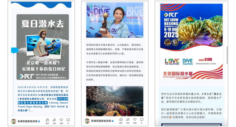 This post promoted the Diving Resort Travel Expo, held in Beijing from 8-10 August. The Philippine Department of Tourism exhibited at the show, alongside 16 other partners, including regional tourism boards, resorts, diving centers, and DMCs.