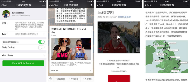 How do Beiwei 55°’s clients find such a small and niche tour operator? At this point, says Baker, “more and more are hearing about us through word of mouth from friends or family who have already toured with us and then share their experience [on WeChat]. Others have found us on a Baidu search or via OTAs like Zhuyouyou in China. They’re great because they really target semi-independent travelers looking for unique, local experiences in the UK.” To put themselves on the radars of these OTAs and travel agents in China, Beiwei 55° has attended tradeshow events and made contact through email to be featured on their platforms. The company also has Official WeChat and Weibo social media channels, run by native Chinese-speaking staff, as well as a more light-hearted Weibo channel featuring content by the company’s guides.