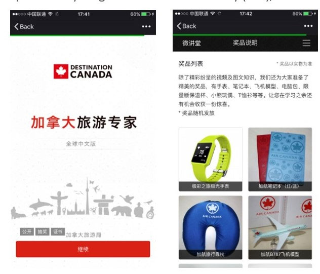 Destination Canada also has a dedicated B2B WeChat account for the Chinese travel trade. This is an important complement to the B2C account, since as of 2016, just over half of Chinese travelers had used a travel agent to help plan their most recent trip to Canada. The B2B account updates travel agents on Canada’s newest products, trade events, visa regulations and other topics that might assist travel agents in China to better sell Canada’s products to consumers. Canada also offers two editions of China Travel Academy, a WeChat-based online training course for travel agents in China to learn more about Canada and how to sell it as a travel destination.