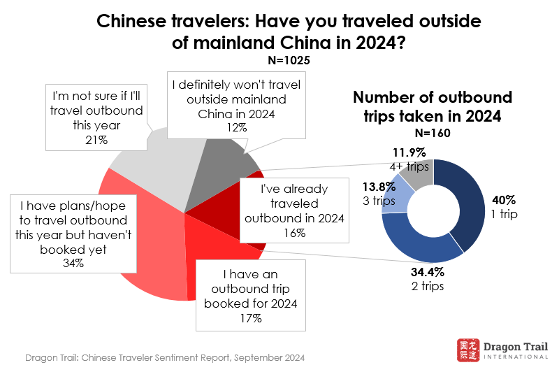 Dragon Trail’s survey data highlights the substantial progress that Chinese outbound travel has made since last year. As of August 2024, 16% of survey respondents had already taken an outbound trip this year, compared to just 4% at this same time last year. Of those who have already traveled outbound in 2024, 60% have taken at least two outbound trips.