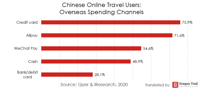 A credit card is the most popular way to spend overseas, but Alipay is very close, thanks to widespread adoption, especially in popular Asian destinations. Visa is the most popular type of credit card (63.4%), followed by Mastercard (54.1%), American Express (29%), and JCB (16.6%).
