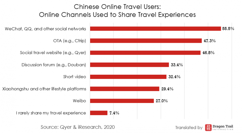 92.6% of Chinese online travel users share their travel experiences online, with WeChat the most popular platform to do so. While the most common reasons for sharing travel experiences online include self expression, recording memories, and sharing beautiful views, 27.6% of users said they went online to complain about parts of their travel experience that they were dissatisfied with.