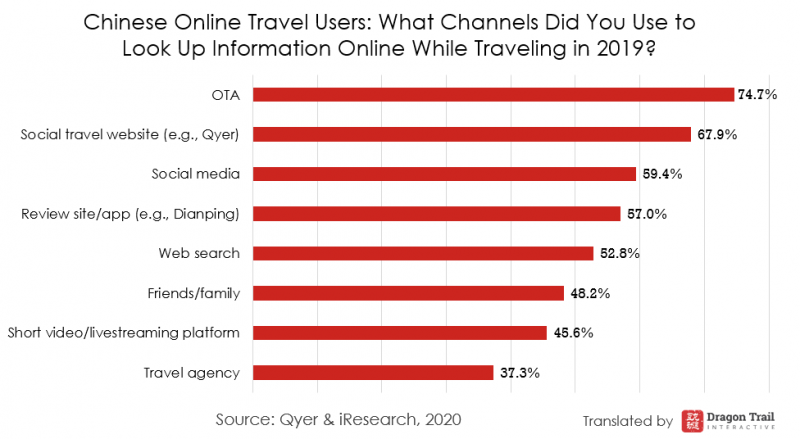Most Chinese online travel users are looking up information on the road, especially checking travel itineraries, accommodation information, local traffic updates, and information on food, destinations, and attractions. OTAs are the most popular channel for this in-destination research, followed by social travel websites such as Qyer, social media, and review apps/websites.