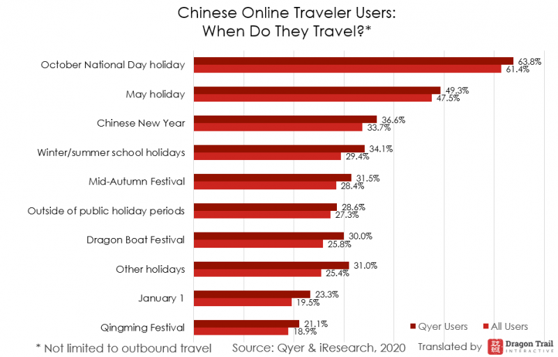 The October National Day holiday is by far the most popular time of year for online travel users to travel, followed by the May 1 holiday, Chinese New Year, and school holidays. The Qingming holiday in April is the least popular holiday period for travel. Click here to learn more about the Chinese holiday calendar.