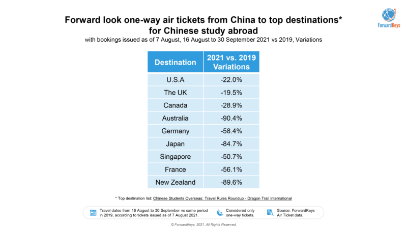 With outbound tourism from China still on hold, international airlines have turned their attention to one group of Chinese who will be traveling overseas in the upcoming months: students. At the same time, booking data from ForwardKeys for one-way tickets departing from mainland China between 16 August and 30 September show a strong correlation to the openness and popularity of the destination country for Chinese students.