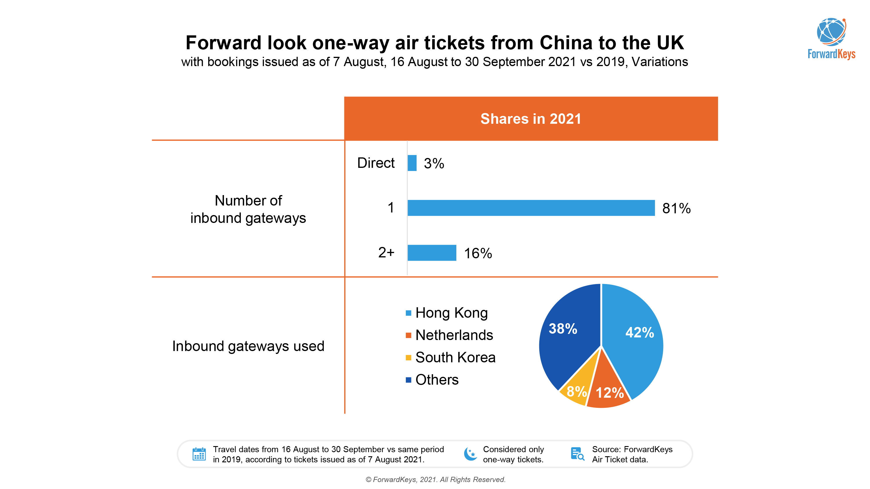 According to issued one-way tickets for travel from mainland China to the UK between 16 August and 30 September 2021, travelers flying directly only account for 3%. 81% will transfer at one hub before reaching the destination, with the rest transferring twice.