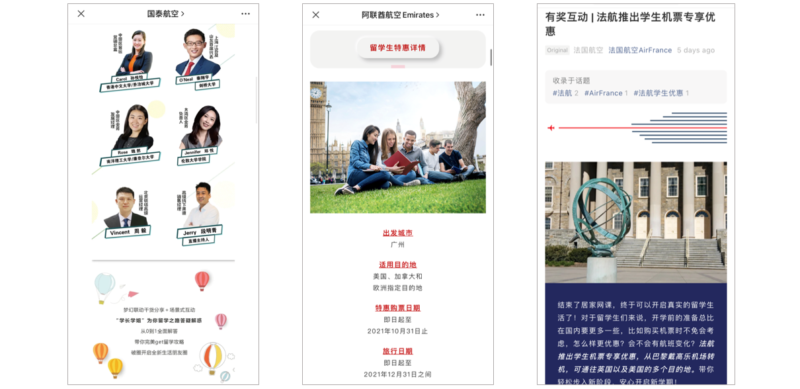 Promotion for Cathay Pacific’s live streaming for students traveling abroad (left), and special offers for students flying from China on Emirates Airline (center) and Air France (right). Images: WeChat