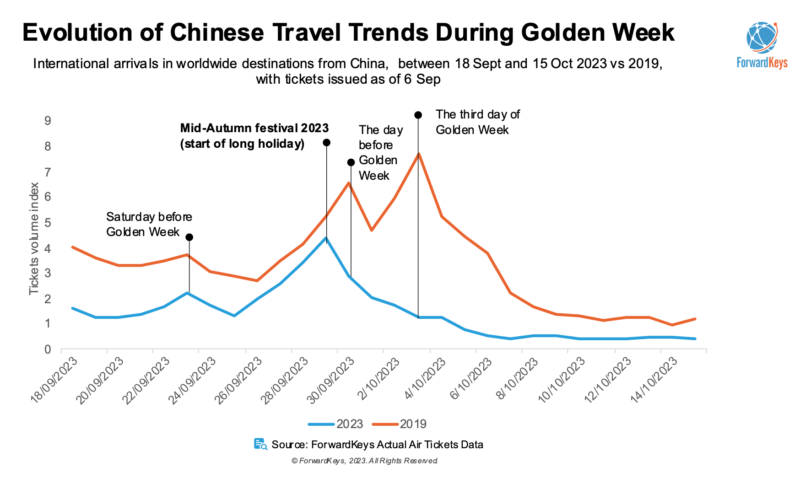 Valencia, 19 September 2023 – ForwardKeys, a travel data and analytics firm, has recently released the latest Chinese travel trends regarding Golden Week, ahead of the much-anticipated webinar with Dragon Trail International on September 21. As of September 6, bookings for upcoming Golden Week travel are 58% lower than the same period in 2019.