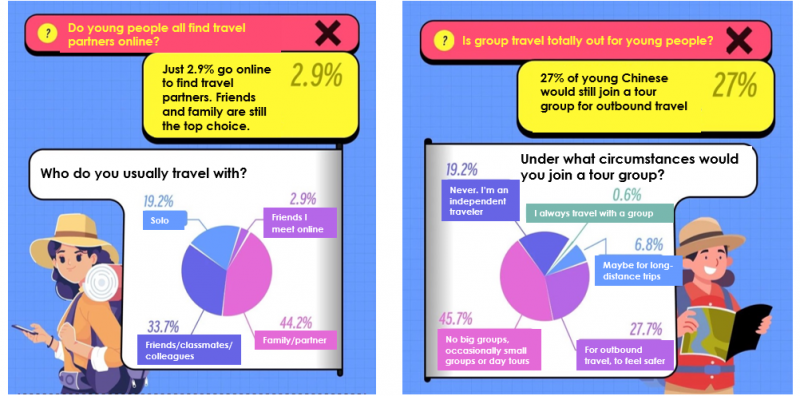 Going online to find travel companions is known as a trend for young Chinese, but actually it’s only the norm for 2.9%. Most prefer to travel with family or their partner (44.2%) or with friends, classmates, or colleagues (33.7%).