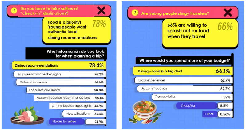 Food is a very important part of the travel experience for young Chinese. Local dining recommendations are the type of information they’re most likely to look for when planning a trip, chosen by 78.4%. At the same time, two-thirds said that they’re willing to increase their budgets to eat well while traveling.