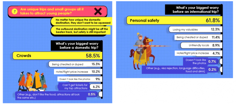 Notable for the outbound tourism industry, 27.7% of young Chinese in Mafengwo’s survey said they would join a group tour for international travel, as a safety precaution.