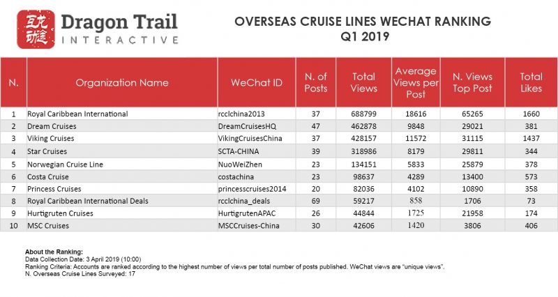 Royal Caribbean International’s most-viewed post for the quarter was a buy-one-get-one-half-off promotion in March, with 65,265 views. For Viking Cruises, their top post was a Chinese New Year promotion at the end of January, with 31,115 views.