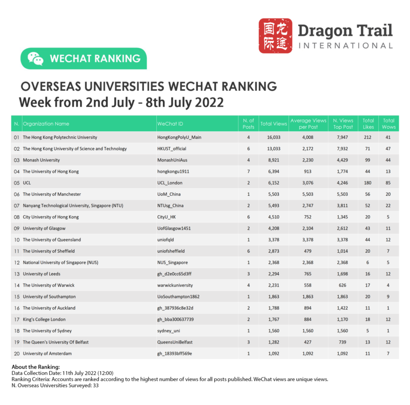 WeChat ranking criteria: Accounts are ranked according to the highest number of views for all posts published. WeChat views are “unique views”.