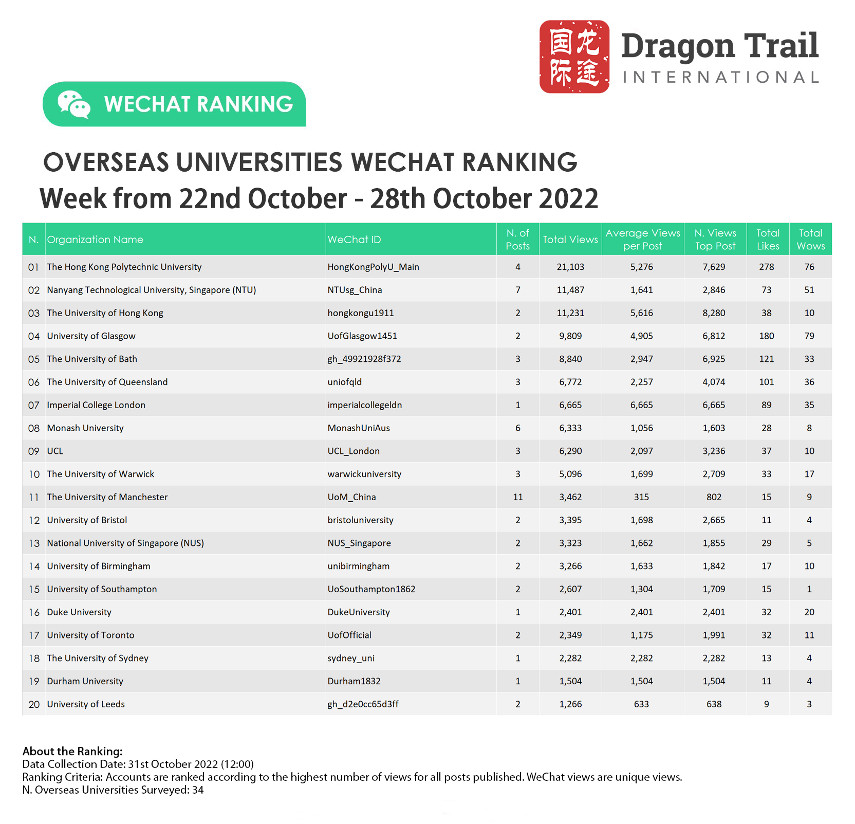 WeChat ranking criteria: Accounts are ranked according to the highest number of views for all posts published. WeChat views are “unique views”.