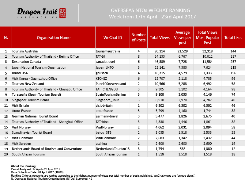 The data is jointly collected and compiled by Dragon Trail Interactive and Dingla, a B2B travel marketing platform assisting foreign organizations build long term travel trade relationships in China.