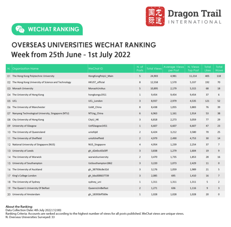 WeChat ranking criteria: Accounts are ranked according to the highest number of views for all posts published. WeChat views are “unique views”.