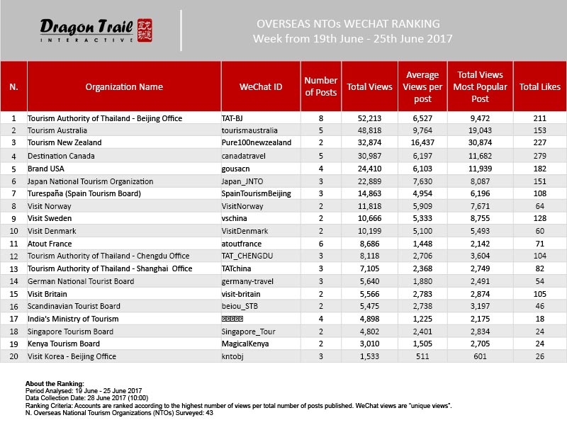 N.1 Tourism Authority of Thailand – Beijing Office: Thailand was back in the top position with 8 articles totaling 52,000 page views.
