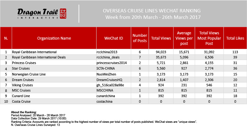 Royal Caribbean International once again came in the top spot and also published the most read article among cruise lines, announcing the appointment of Taiwanese artist Lin Zhiying as brand ambassador.