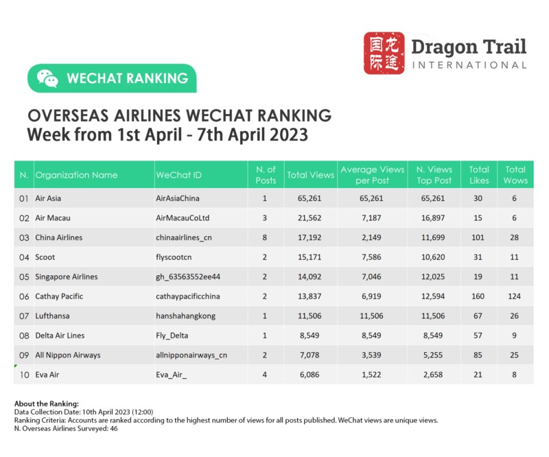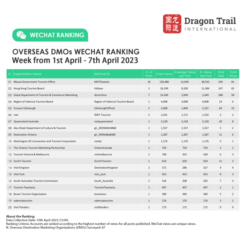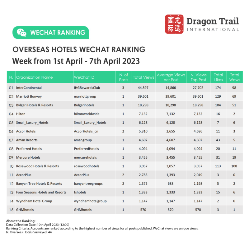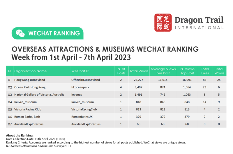 The top-ranking WeChat accounts for travel destinations, airlines, cruise lines, museums & attractions, and hotels, for the week of 1-7 April 2023.