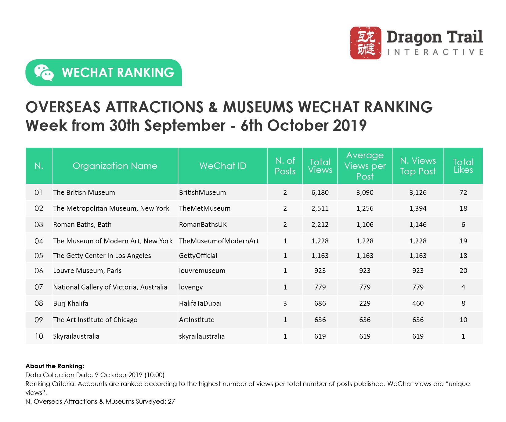 The top-ranking WeChat accounts for travel destinations, airlines, cruise lines, museums & attractions, and hotels, for the week of 30 September-6 October, 2019.