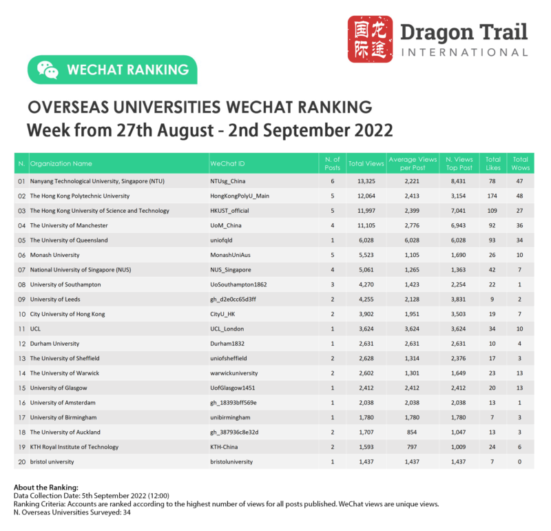 WeChat ranking criteria: Accounts are ranked according to the highest number of views for all posts published. WeChat views are “unique views”.