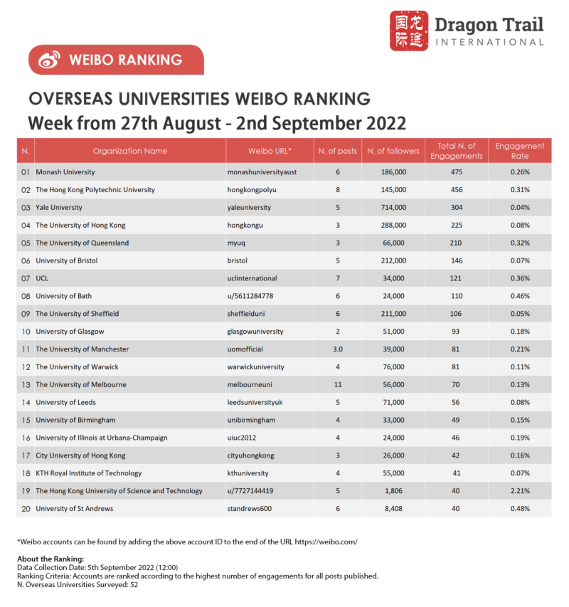 Weibo ranking criteria: Accounts are ranked according to the highest number of engagements for all posts published.