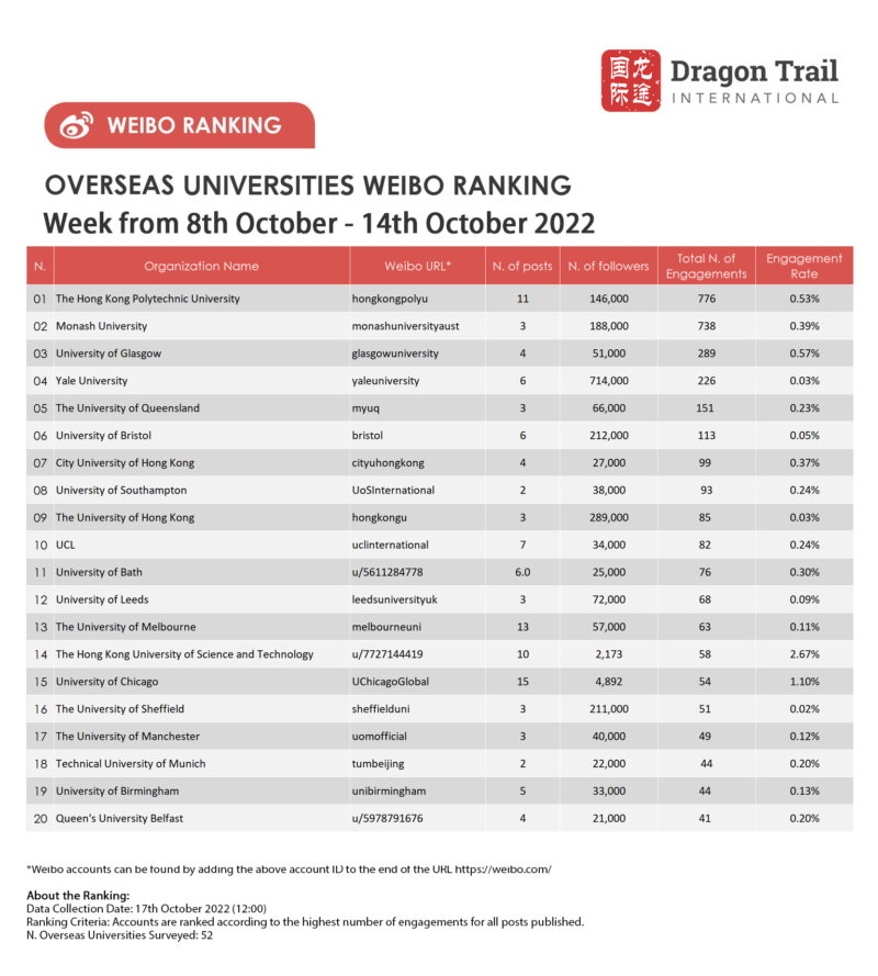 Weibo ranking criteria: Accounts are ranked according to the highest number of engagements for all posts published.
