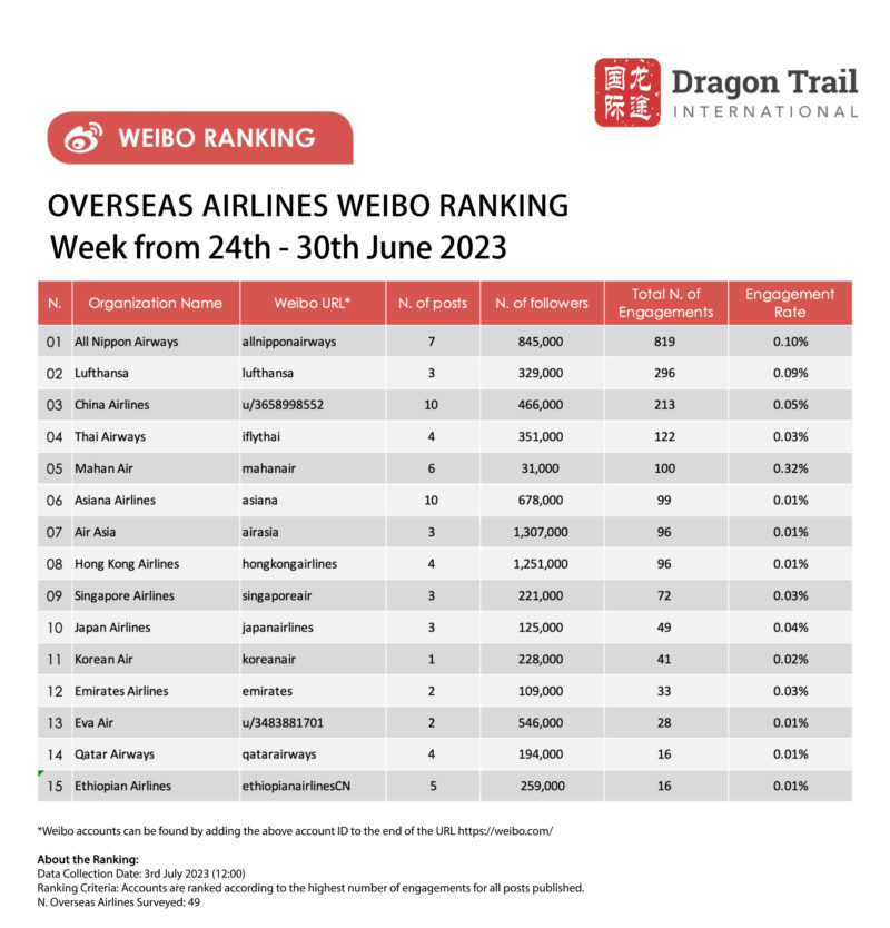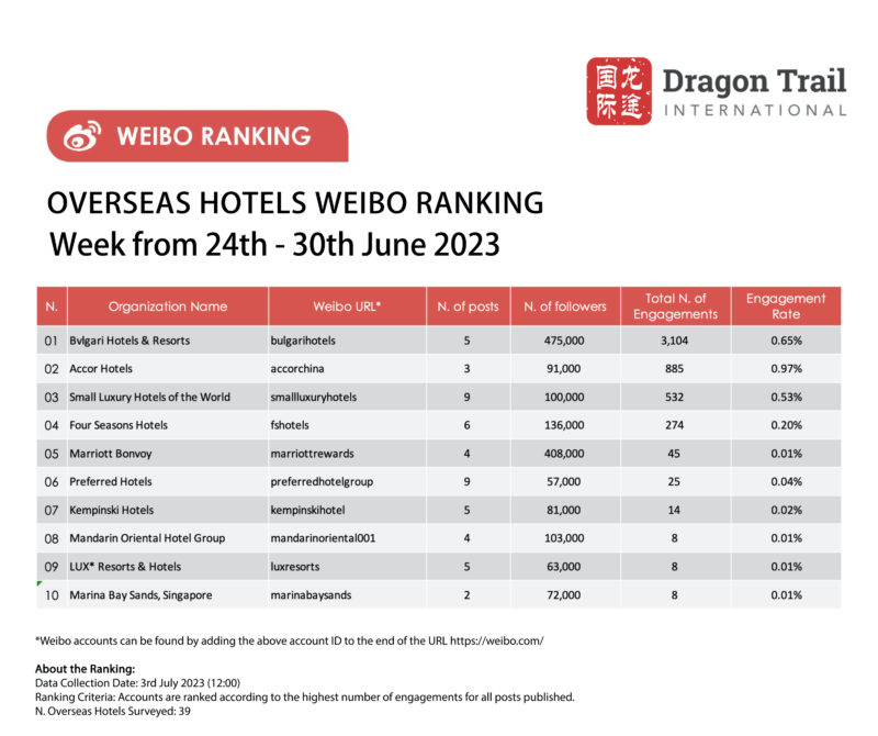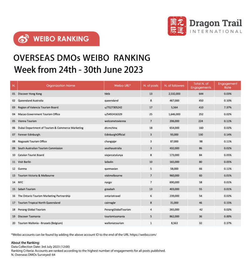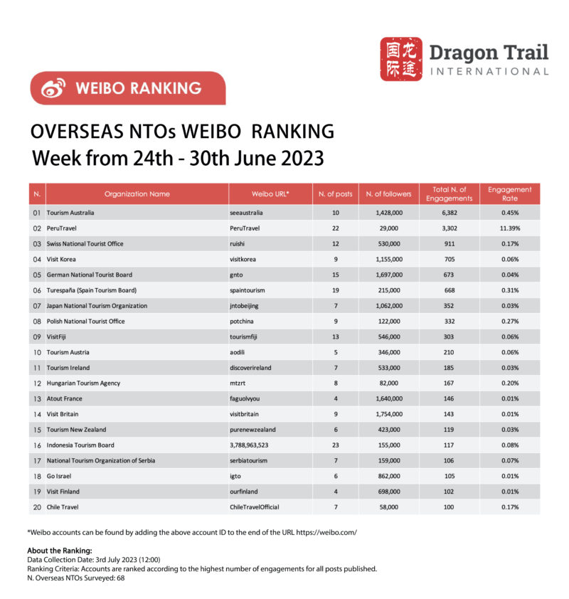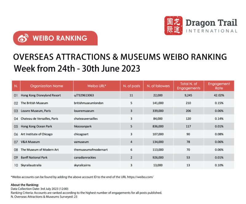 The top-ranking Weibo accounts for travel destinations, airlines, cruise lines, museums & attractions, and hotels, for the week of 24-30 June 2023.