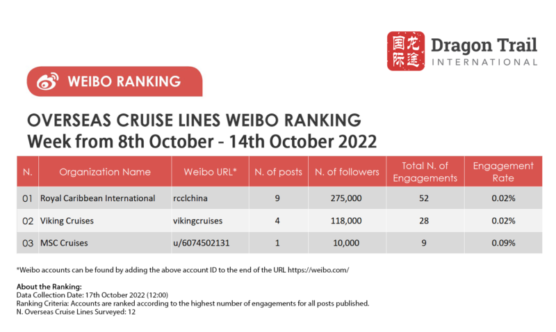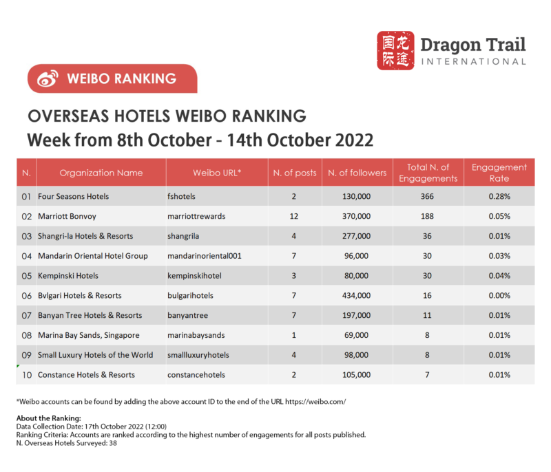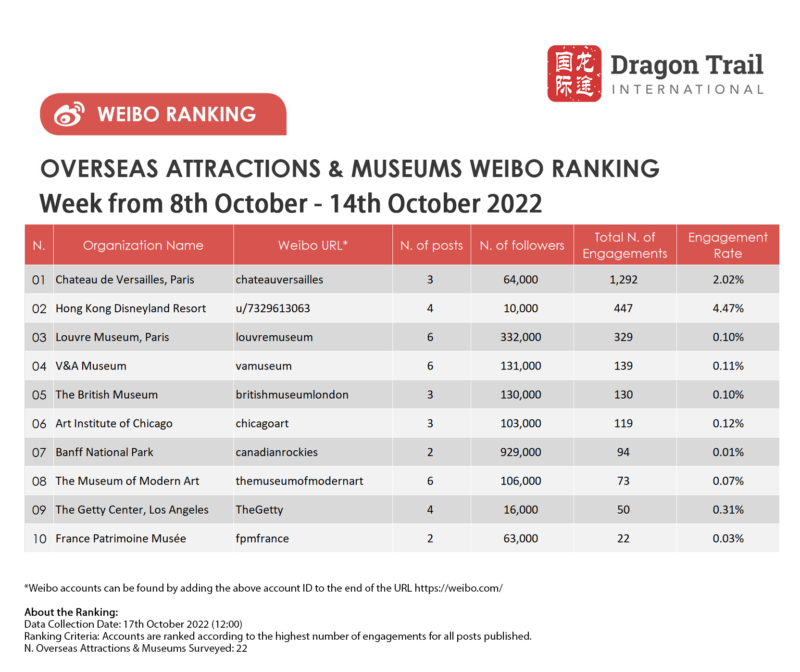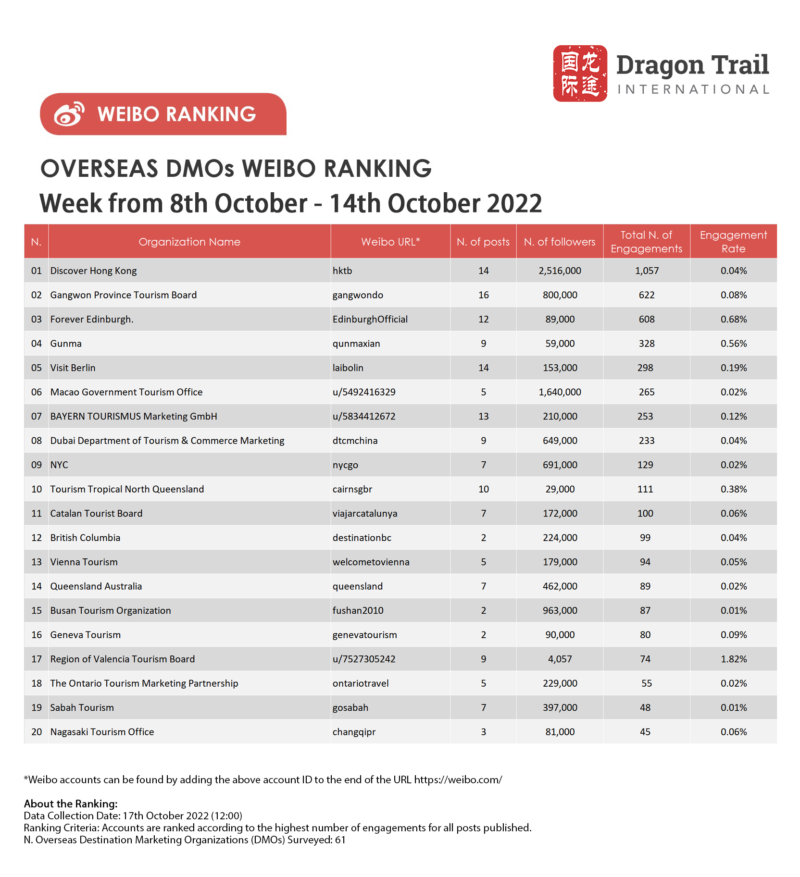 The top-ranking Weibo accounts for travel destinations, airlines, cruise lines, museums & attractions, and hotels, for the week of 8-14 October 2022.