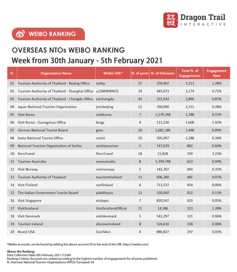 N.3 Tourism Authority of Thailand – Chengdu Office: Thank you to Sina Travel for naming Thailand 2020’s most influential overseas destination. (View)